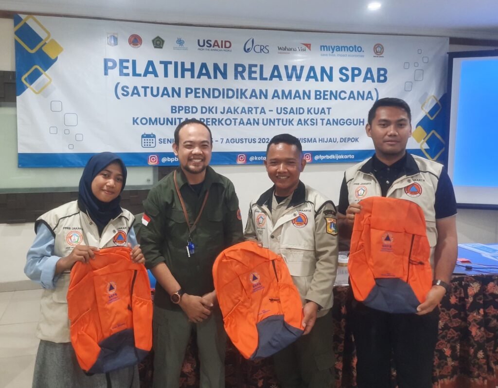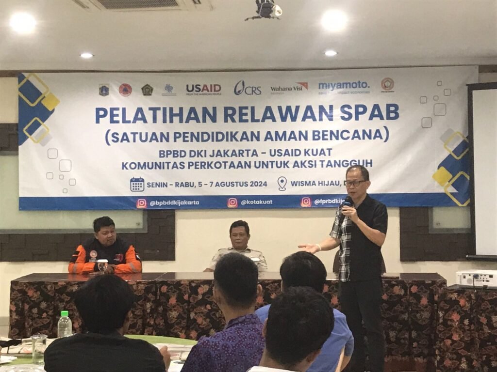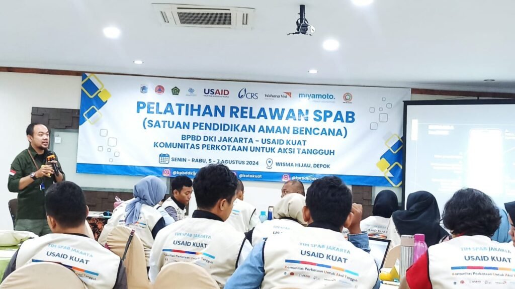 Upaya peningkatan kapasitas relawan dalam penyebaran informasi dan peningkatan kesiapsiagaan warga sekolah dapat dilakukan berbagai cara, salah satunya yang dilakukan oleh Forum Pengurangan Risiko Bencana (F-PRB) DKI Jakarta sebagai wadah dari berbagai unsur lembaga bersama BNPB dan BPBD DKI Jakarta dengan dukungan USAID KUAT  menyelenggarakan Pelatihan Relawan SPAB di Wisma Hijau, Depok, Jawa Barat pada 5 – 7 Agustus 2024. Kegiatan awal akan menyasar pada 96 sekolah/madrasah di Kecamatan Gambir (Jakarta Pusat) dan Kecamatan Kramat Jati (Jakarta Timur).